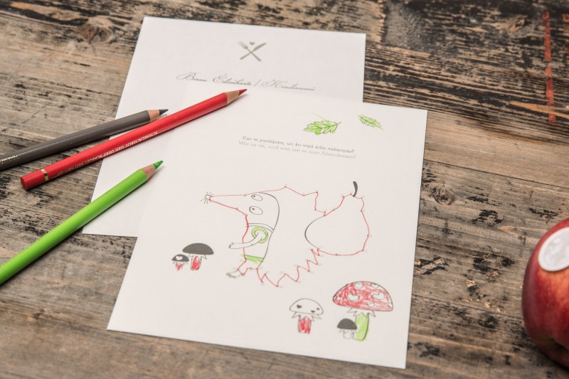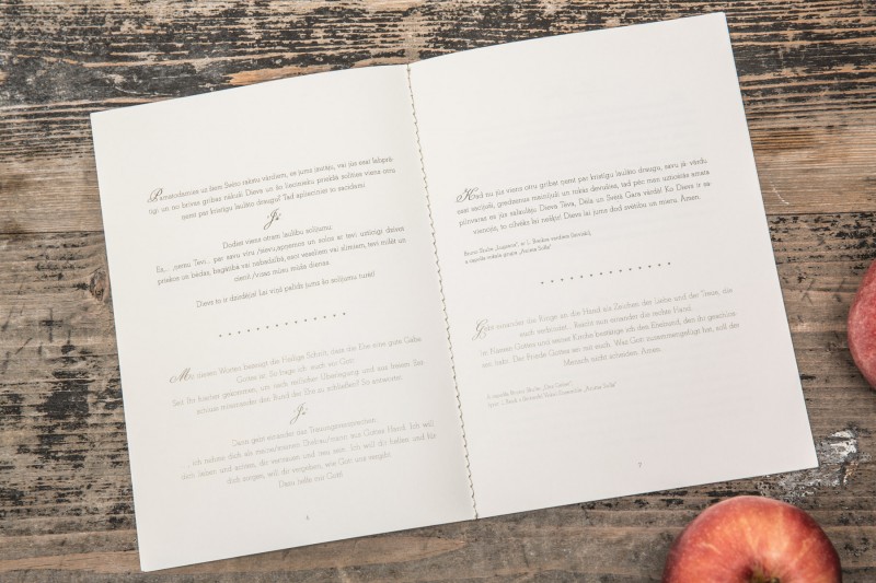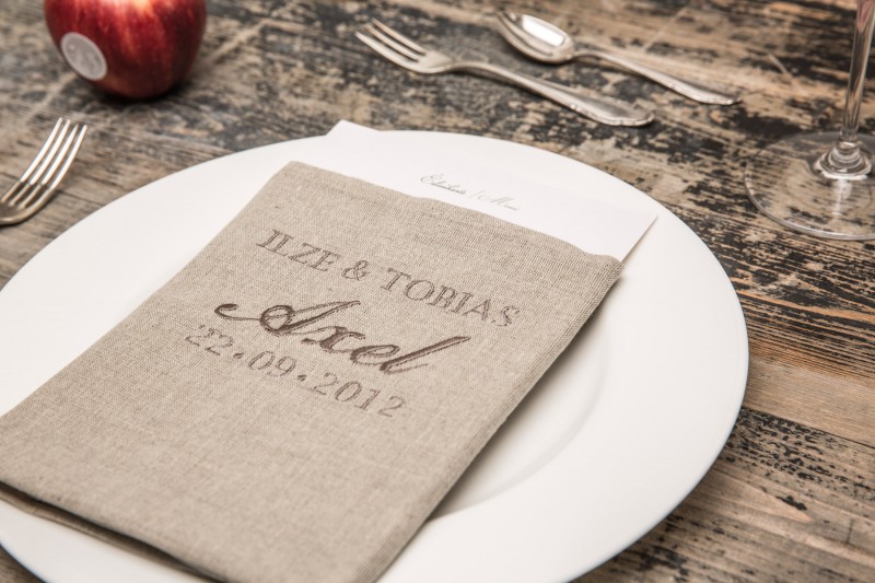 What combines Bavaria and Latvia is certainly the love between Ilze & Tobias and their closeness to rural traditions. The logo shows illustrated profiles of the couple. Each of them in their typical costume. The folklore theme can be found in all details of the wedding. Natural fabrics and materials such as hand-embroidered linen napkins or even apples instead of flowers in the vases .