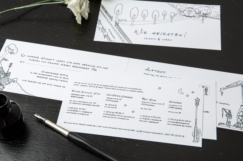 The purely hand drawn design for the wedding of Kristin & Curvin plays with ink illustrated maps of alle the different location for the celebration.
